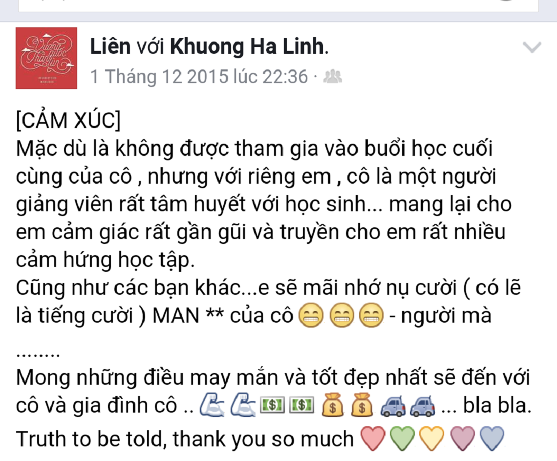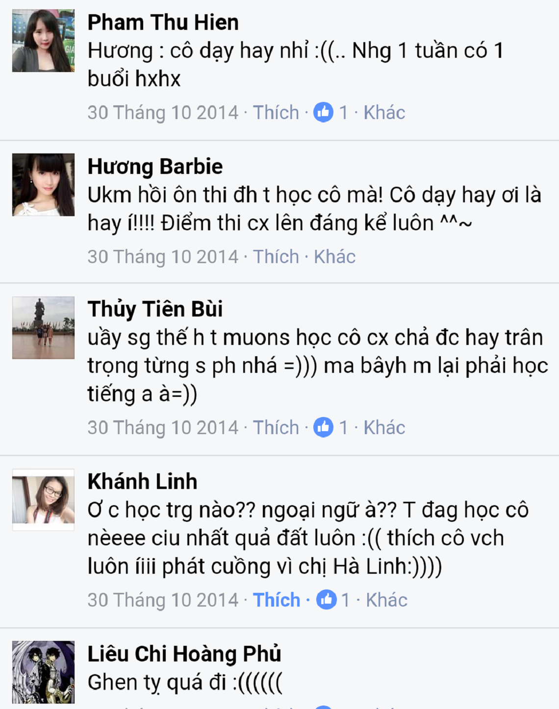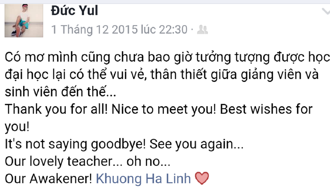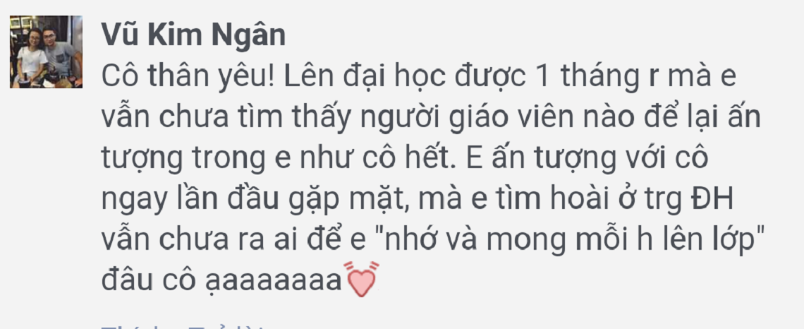 Là Giao Viên thích nhất là được sinh viên, học viên các hệ mình dạy yêu mến...! Có 1 chút tự hào nhẹ.. vì những năm qua mình đã làm được đó là những tình cảm rất đáng yêu m nhận được từ các sinhh viên chính quy, các a/chị hv cao học, các thầy cô giáo tiếng anh ở các tỉnh....!