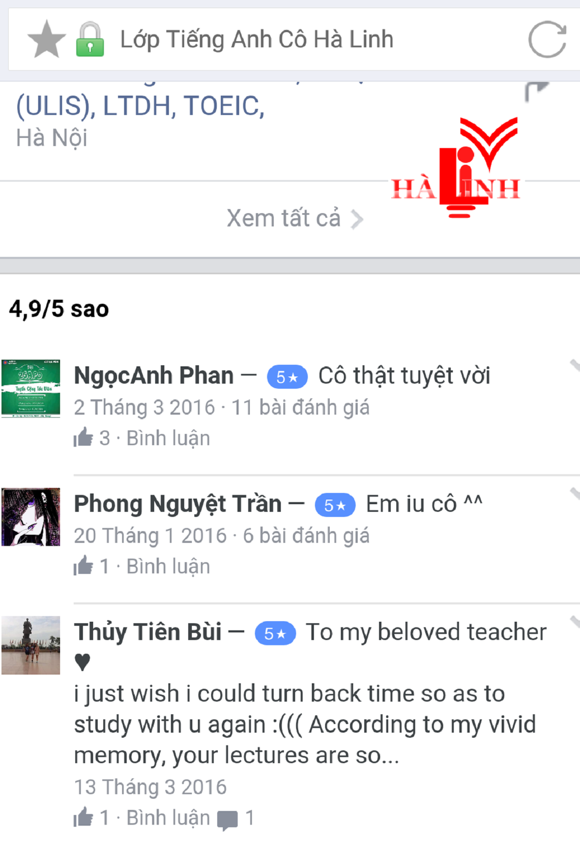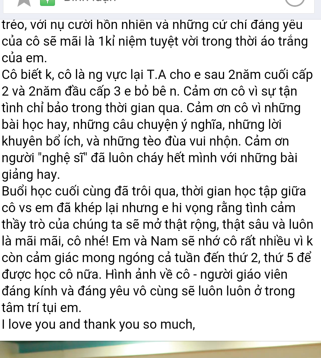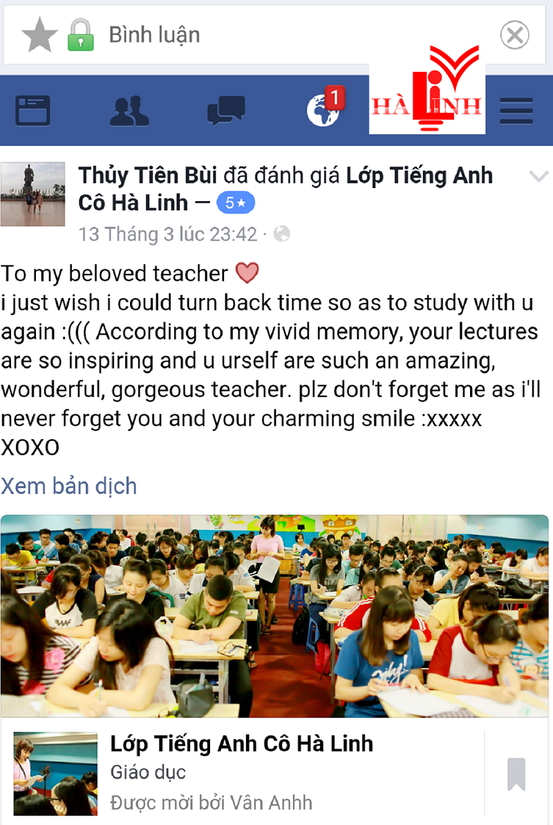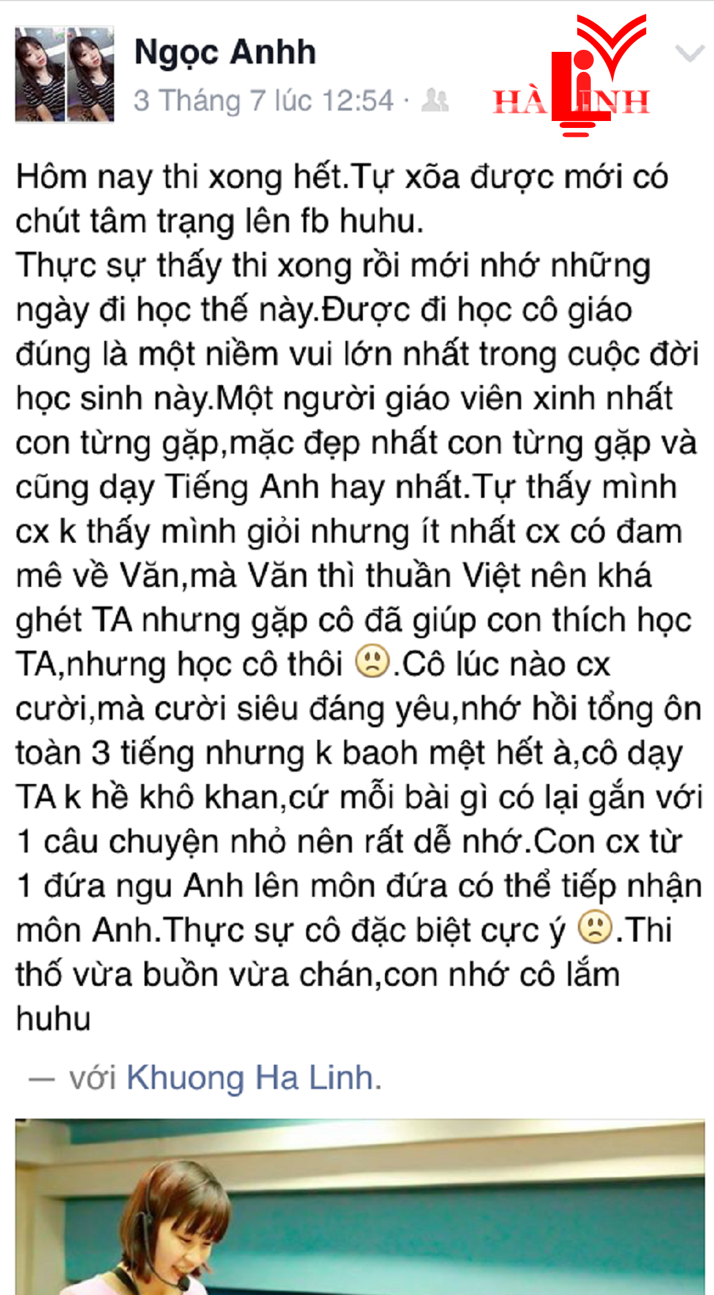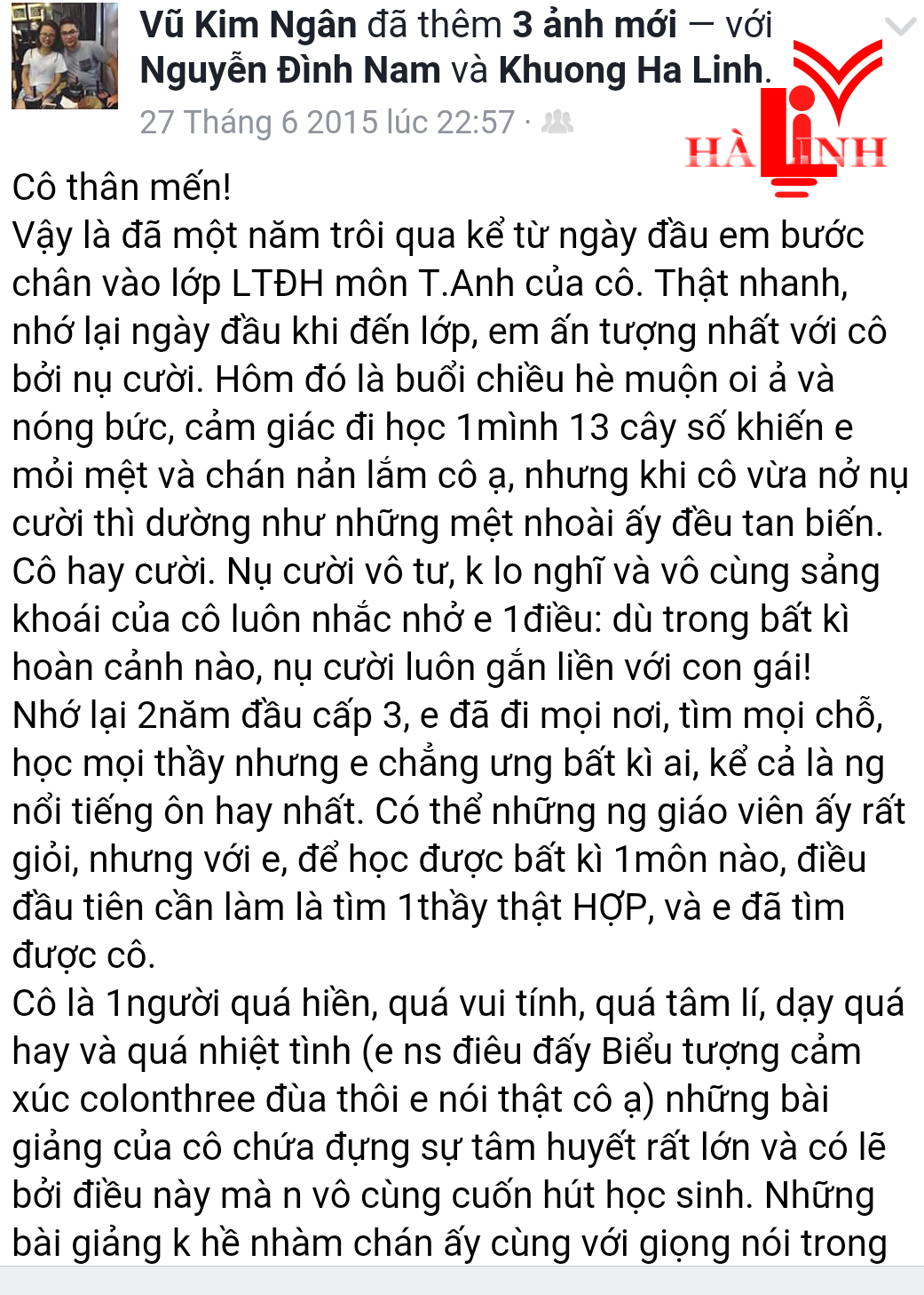 Mặc dù là giảng viên dạy đại học với đối tượng chính là sinh viên và học viên cao học nhưng cô Hà Linh luôn có 1 lớp luyện thi THPT quốc gia duy nhất ở 19 Hàng Bài -Hà Nội, đối tượng là các em hs lớp 12 đến từ các trường cấp 3 như Trần Phú, Việt Đức, Chu Văn An, Nguyễn Gia Thiều, Trần Nhân Tông..... ! Lớp đông hàng trăm em học sinh, gắn bó cả năm trời.. và rồi có em đi DU HỌC, có em thành sv của NGOẠI THƯƠNG, NGOẠI NGỮ QG và các trường top đầu của Hà Nội.. có em thành SV của cô ở ĐẠI HỌC QG.. càng dạy càng thấy hs HÀ NỘI quá đáng yêu. Rất nhiều tn báo kq điểm cao trên 8, 9, cards chia tay ngậm ngùi, những dòng tâm sự của các em....làm cô cảm động. Và đây là số ít những lời làm cô ấn tượng mà nhờ face mới ghi lại được...!
