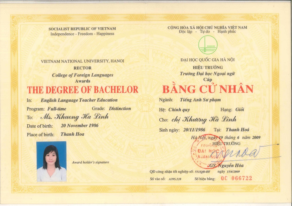TỐT NGHIỆP LOẠI GIỎI NGÀNH TIẾNG ANH SƯ PHẠM TRƯỜNG ĐẠI HỌC NGOẠI NGỮ- ĐẠI HỌC QUỐC GIA HÀ NỘI NĂM 2009